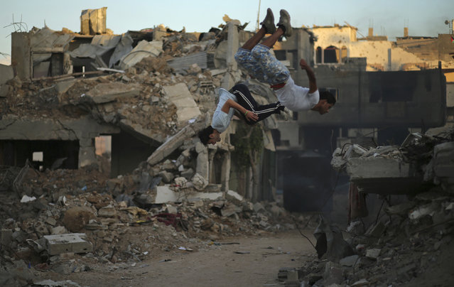 Des enfants traversent l’espace, courent, parcourent les restes d’immeubles et de rues. Dans ce paysage apocalyptique, la vie survit, l’élan se poursuit d’un mur à l’autre dans ces champs de ruines et de bombes. Les photos de Mohammed Salem à Gaza saisissent ses jeunes qui évoluent dans cet univers à l’urbanisme éventré, cet univers clôturé où la densité de la population est si forte que la nature a cédé sous le poids des hommes et sous les bombardements répétés. Les photos rendent la vie qui survit et offrent ces instantanés de vie, à ces jeunes plus vivants que terroristes, plus vivants que morts, et ce alors que l’espérance de vie à Gaza peut s’avérer brève et aussi furtive qu’un saut au-dessus d’un mur de séparation.