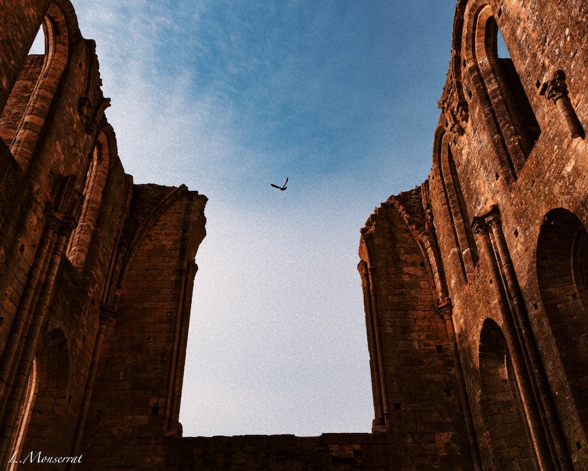 En effet, la collégiale de Larchant s’est ouverte sur la nature, détruite au fil des temps, s’effondrant sous son poids et le manque d’entretien : elle offre d’étonnants espaces de recueillements, non plus aux pénitents, ceux-ci n’empruntent plus ses travées, mais aux oiseaux, désormais seuls hôtes de cette demeure autrefois consacrée au Dieu des catholiques. Les murs, les portes, les fenêtres sont ouverts aux quatre vents, aux ombres multiples dont la trace s’immisce dans les déambulatoires, comme un rappel des calculs exercés par les anciens architectes pour ouvrir les lieux à la lumière du soleil.